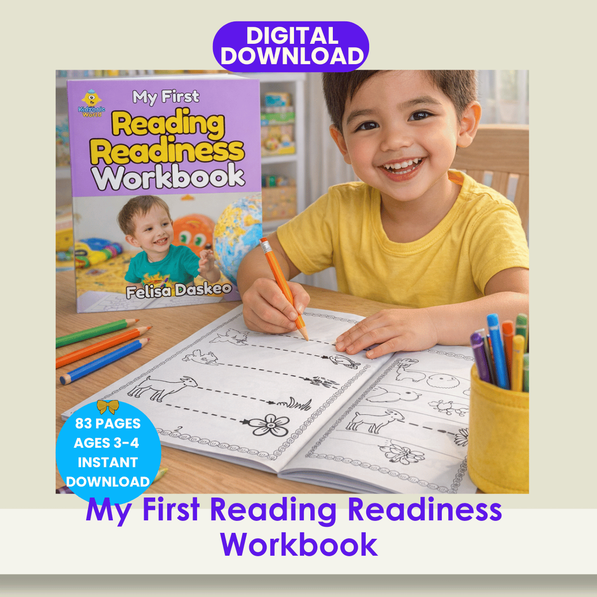 My First Reading Readiness Workbook is a fun and developmentally appropriate early learning workbook designed for toddlers and preschoolers ages 2–4. This 78-page workbook helps young children build essential pre-reading and thinking skills through playful, hands-on activities using familiar objects and simple visual tasks.